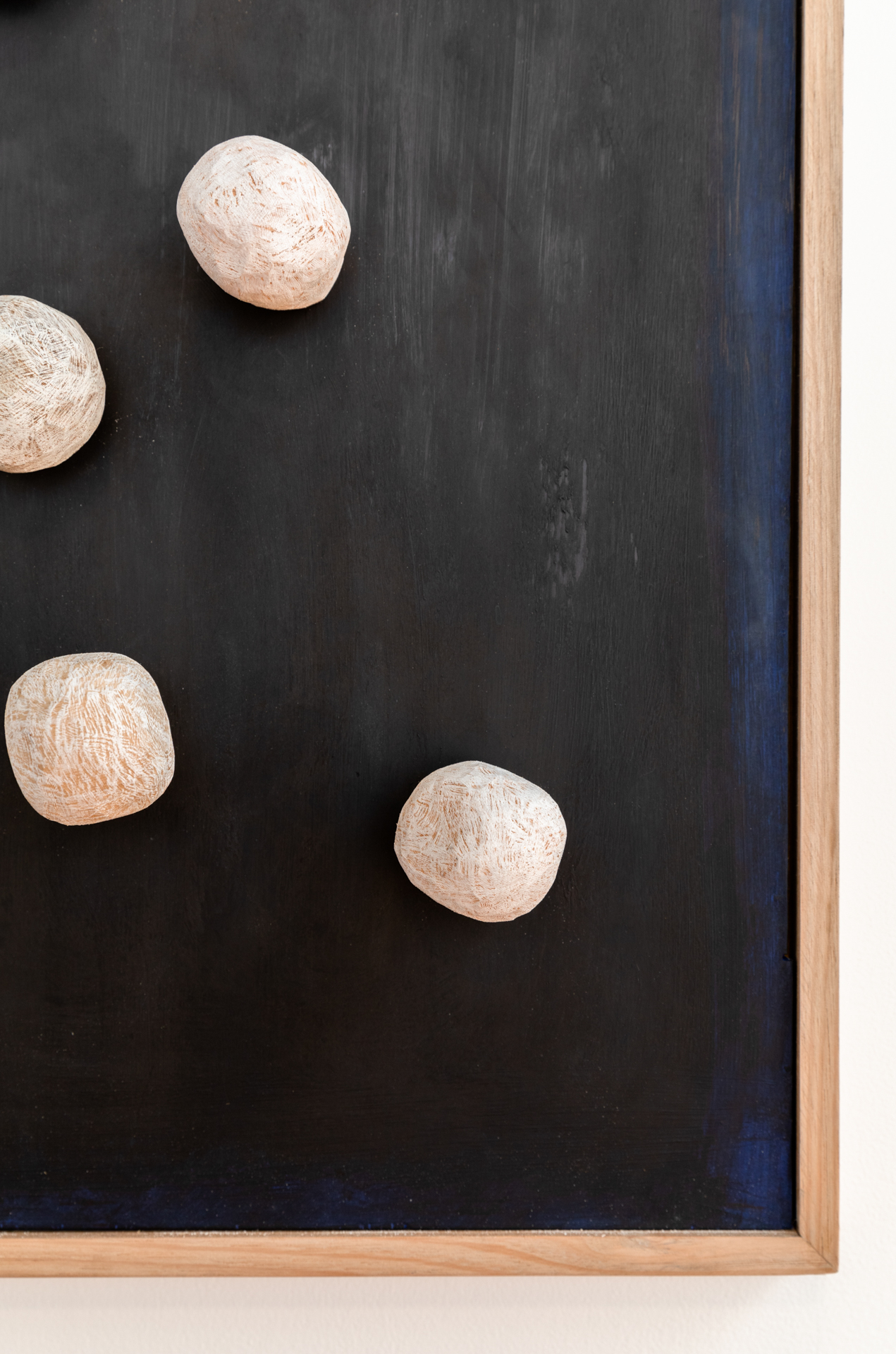 A Hole in the Fence uses plywood and found timbers including King Billy, an endemic Tasmanian conifer. The wood has been arranged as variable rings on handmade brass hooks and the work feels like an assortment of material origins brought together to propose a harmony. On the hooks hang loops of the various timbers, carved, painted and suspended like a collection of keys that describe negative space. Nosy Neighbour uses Huon Pine, King Billy and Tasmanian oak. Timbers are arranged as a cosmology of white spheres on a black surface. The specifics of material are important with pencil, wax and acrylic binders applied to both push and engage with specialised timber surfaces.