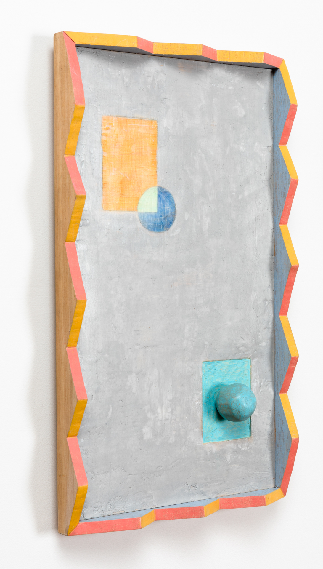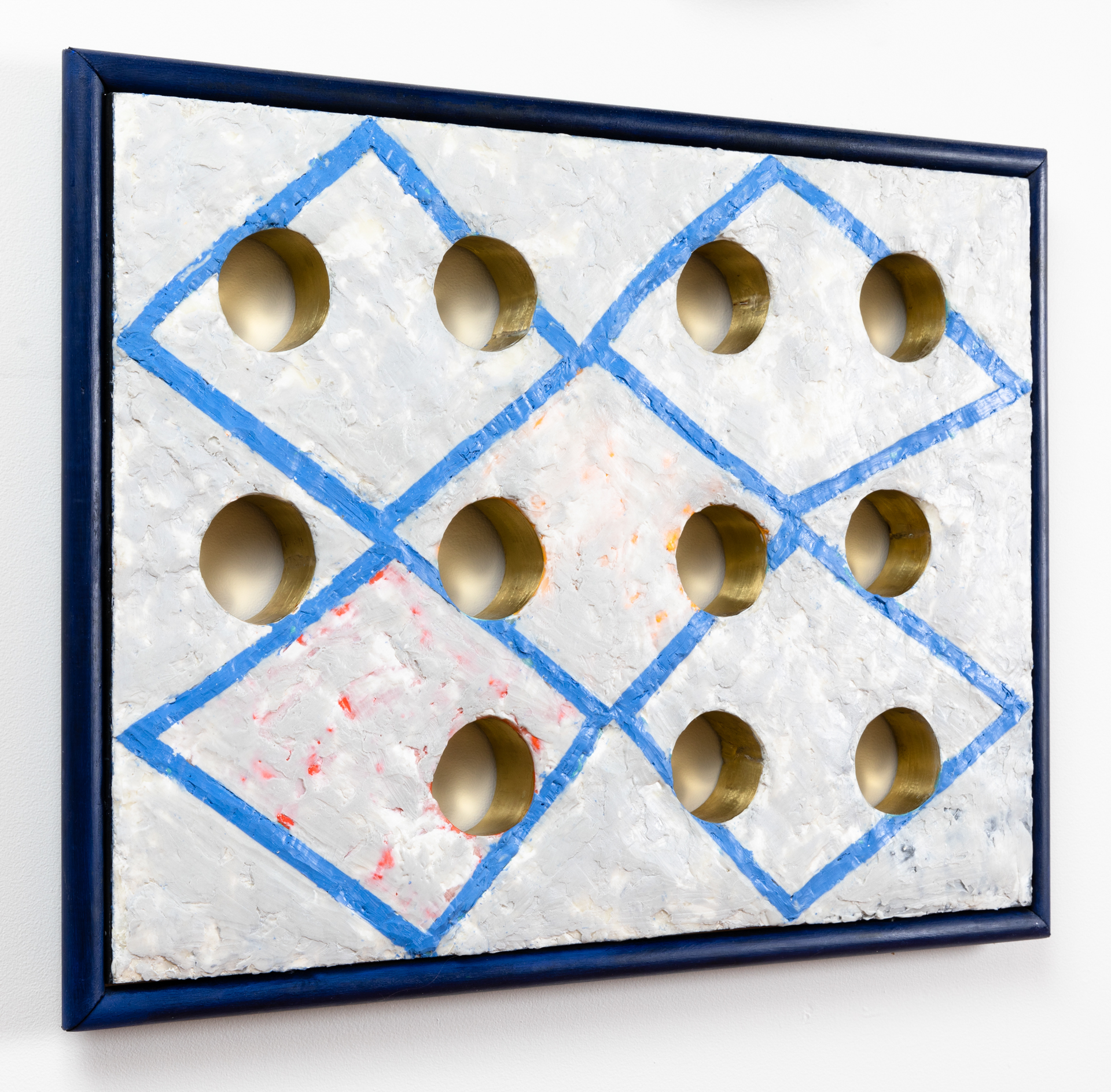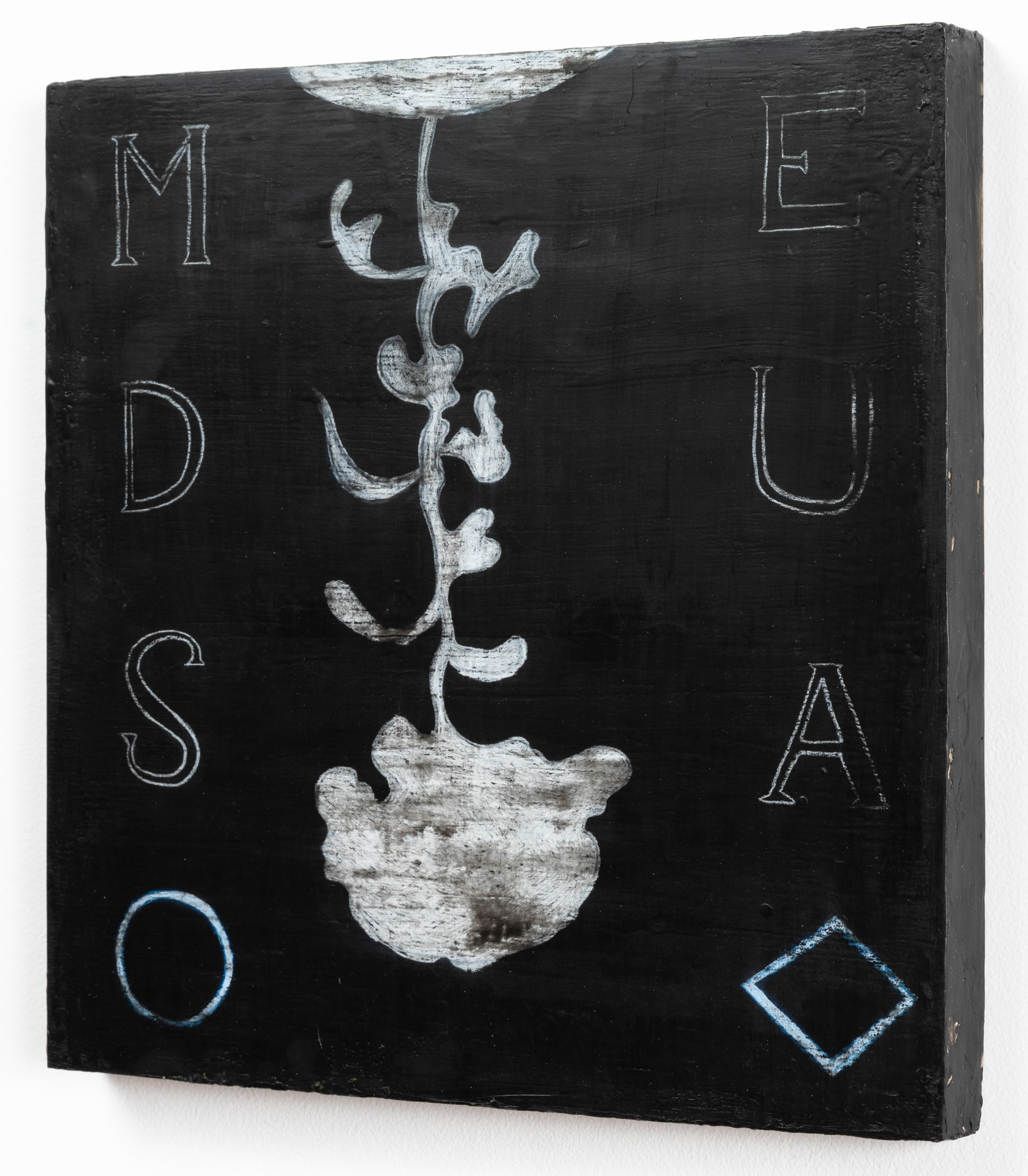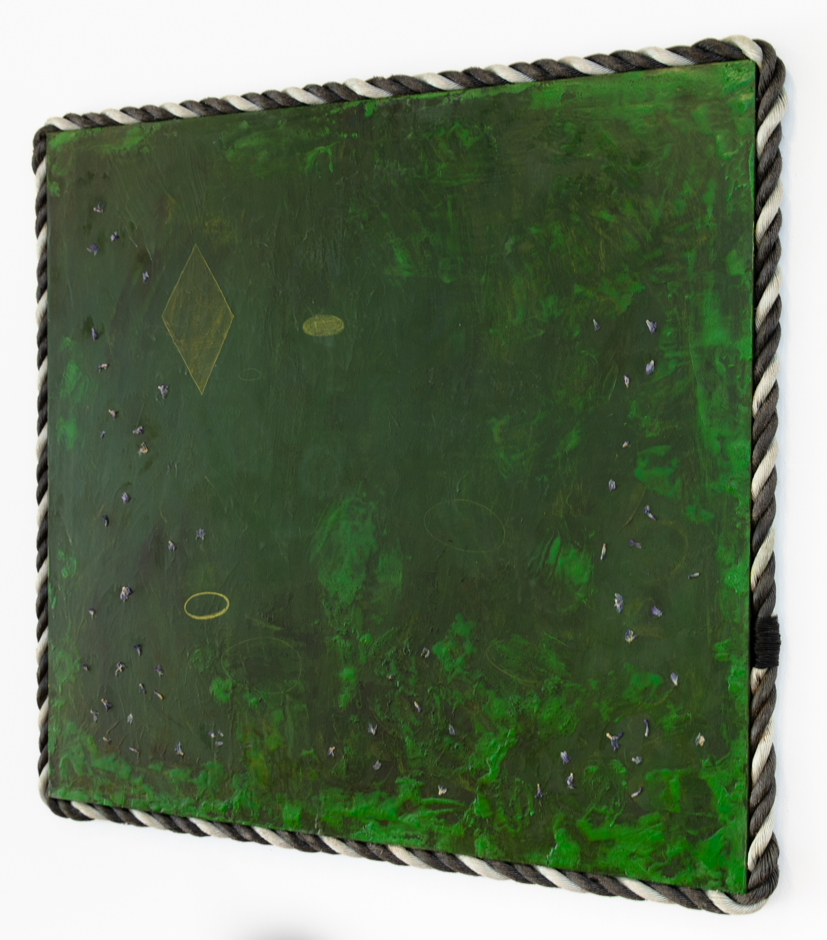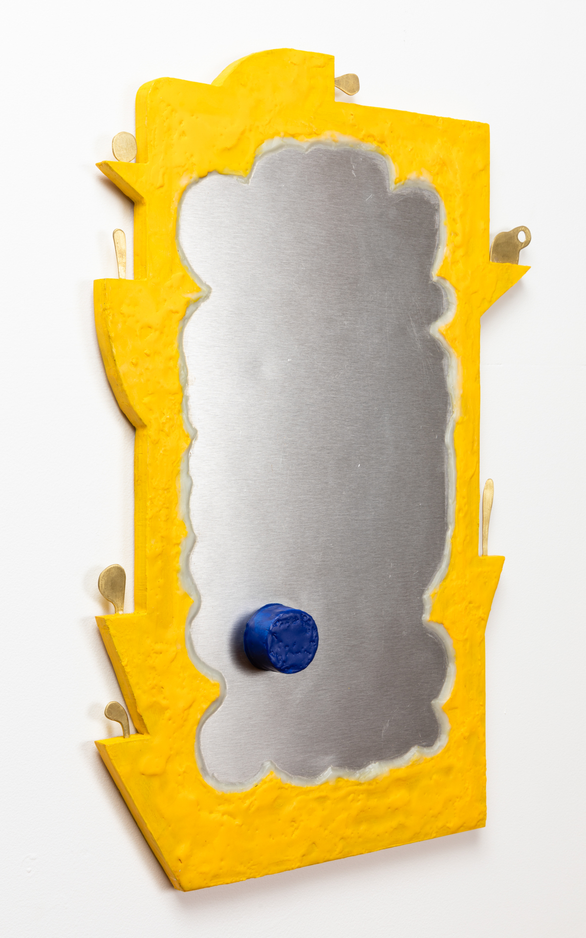 The artist has a background in sculpture and jewellery making and completed a residency over 2020-2021 at Contemporary Art Tasmania. With an understanding of soldering and braising, this knowledge creeps into the pieces through the handmade brass attachments and the use of sanders and other tools to model the material. The works have pictorial elements, particularly in their connection to the variable qualities of the weeds encountered, their colours and forms. But in being almost-paintings they are also almost-objects, suggesting shelves, mirrors, hinged doors or framing devices. Each work reaches for a satisfying sense of containment and a structural integrity.